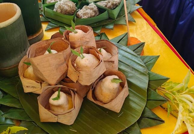 “Silakan dicicipi,” kata perempuan muda yang menjaga salah satu stan. Ia menunjuk pada kue yang sepintas bentukannya mirip jambu air. Hanya saja warnanya putih. Irisan daun pandan di bagian atas kue tak ubahnya tangkai pada buah jambu. Kue itu ditaruh dalam wadah-wadah kecil yang terbuat dari ôn keurusông alias daun pisang tua yang sudah kering. Ditata di atas “pinggan” daun pisang segar yang sudah dilayu di atas api.