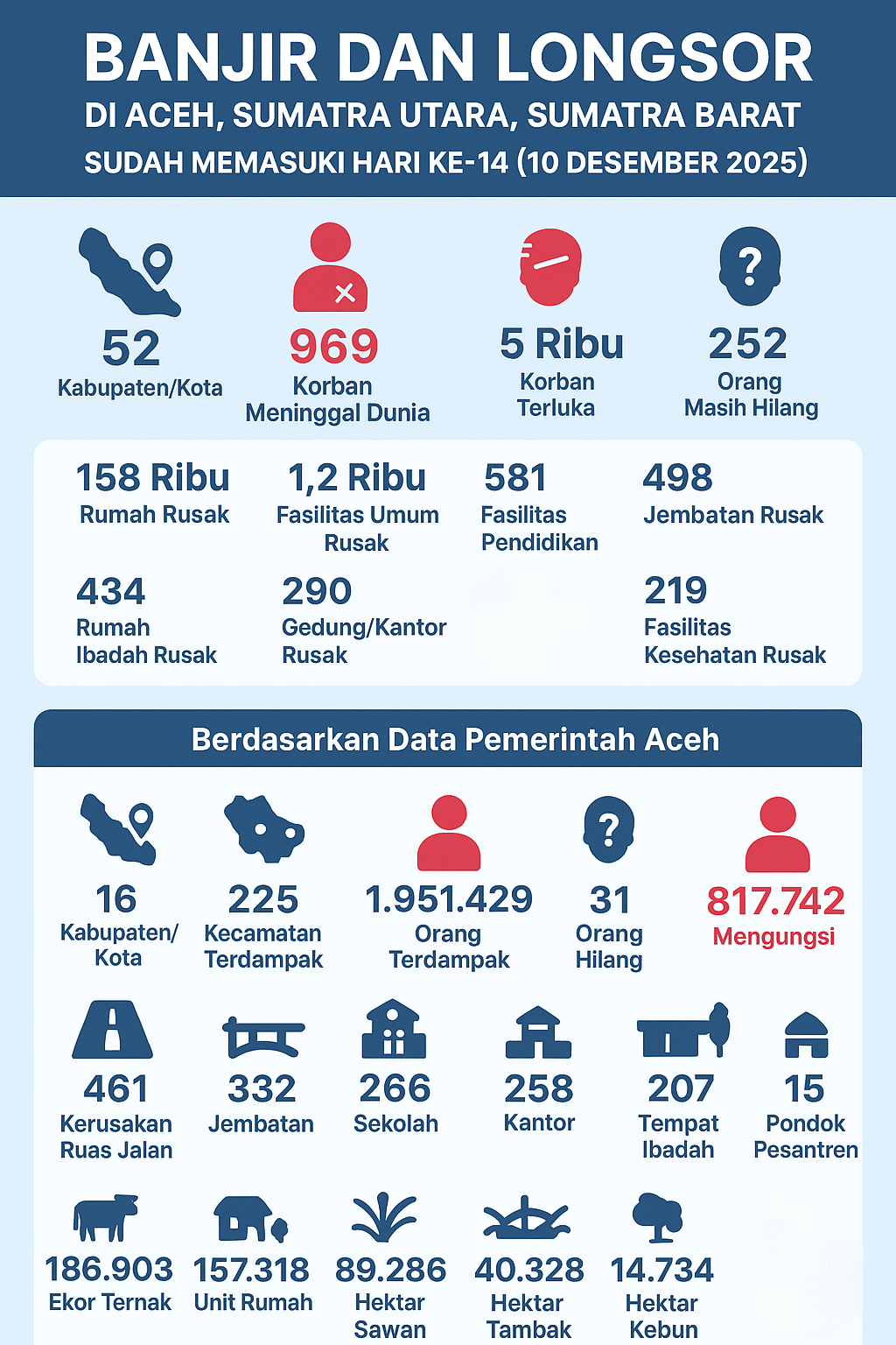 The floods and landslides in Aceh, North Sumatra, and West Sumatra have entered their 14th day (December 10, 2025). Based on data from the National Disaster Management Agency (BNPB) accessed on December 10, 2025, these Sumatran floods and landslides have impacted 52 Regencies/Cities. The death toll stands at 969 people, approximately 5 thousand people are injured, and 252 people are still missing. Other impacts include around 158 thousand damaged houses, 1.2 thousand damaged public facilities, 581 damaged educational facilities, 498 damaged bridges, 434 damaged houses of worship, 290 damaged buildings/offices, and 219 damaged health facilities.